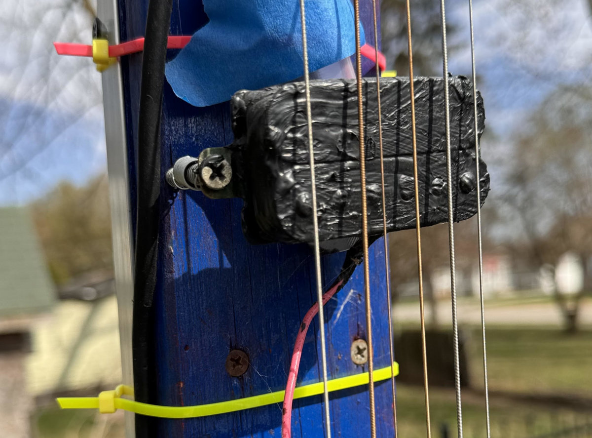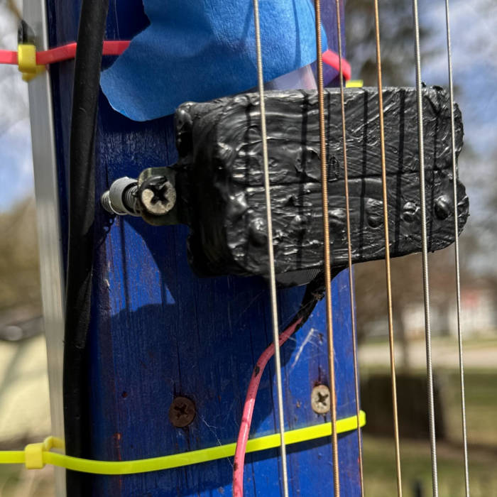 My electric aeolian harp uses 6 strings and stereo humbucking pickups. The only reason for this particular configuration is that using common guitar parts makes this project cheap to build and inexpensive if an idea does not work out. Mine is not the only instrument out there though I do not know of any others electric harps built to deal with the elements except the shed example referenced on the first album description. .